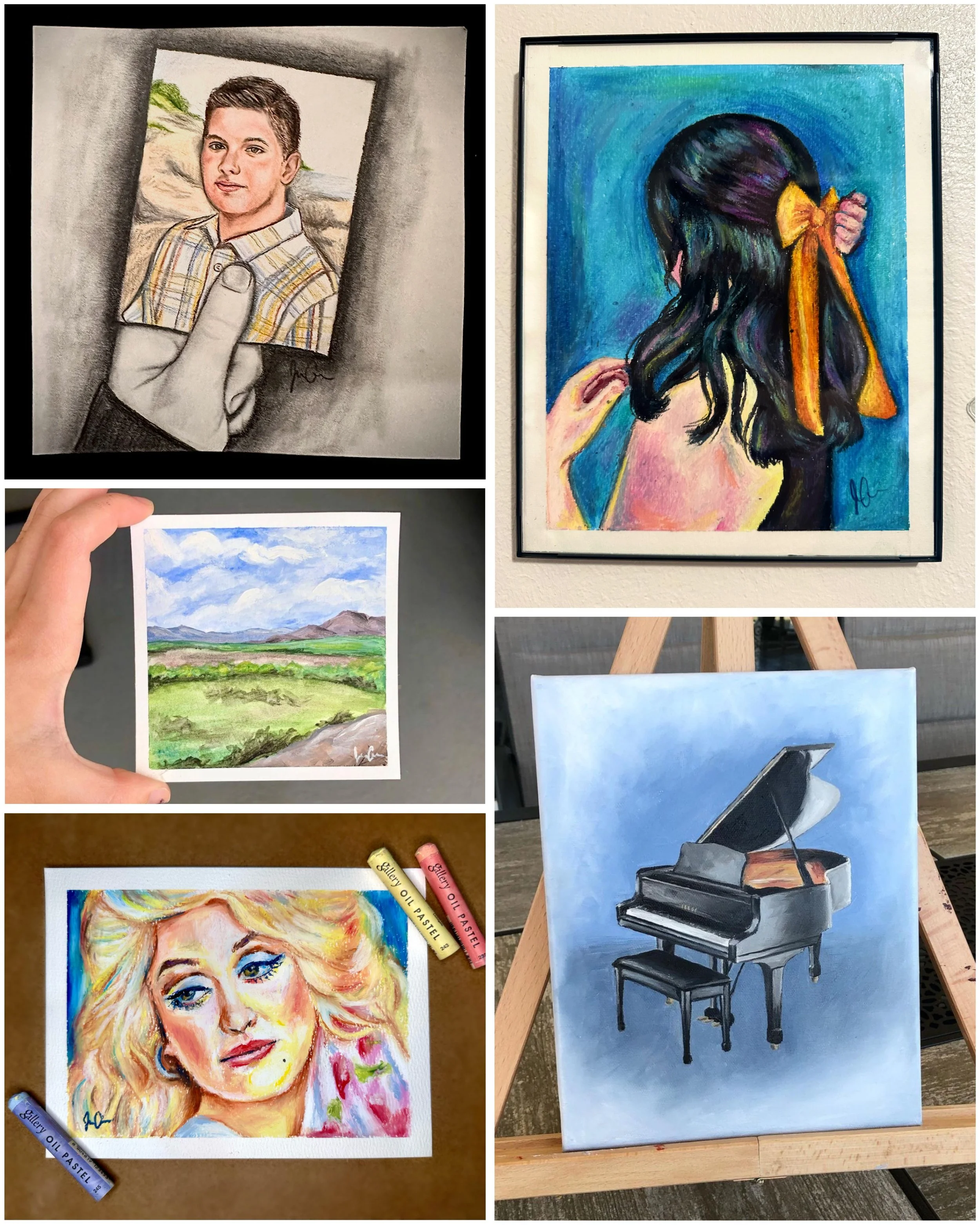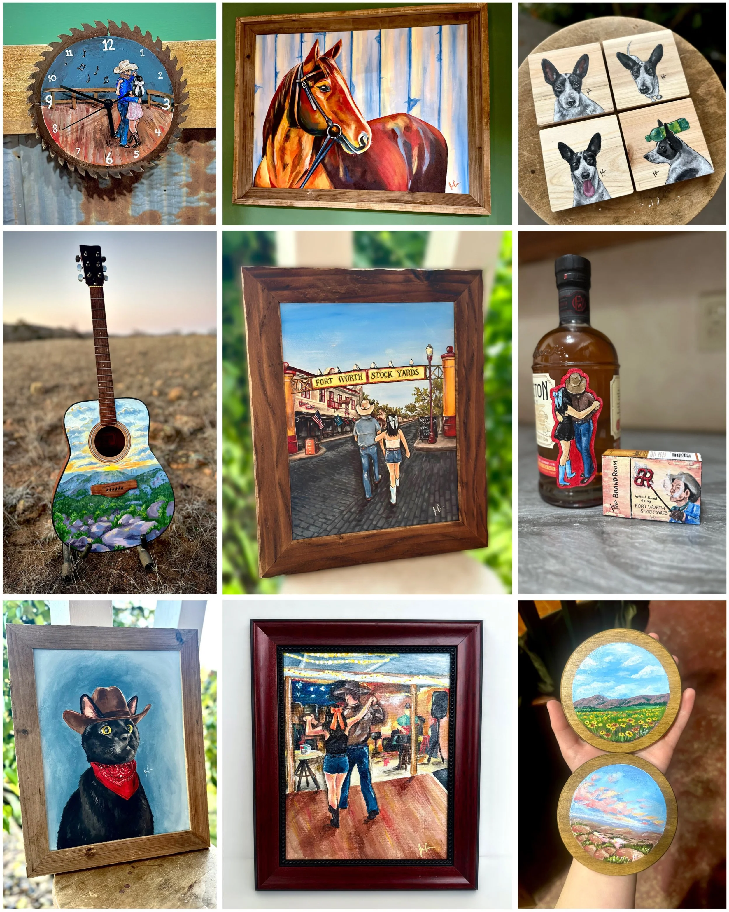 To the left are my recent Acrylic paintings. I enjoy incorporating my other hobbies into my work, whether it’s exploring the Fort Worth Stockyards or dancing on a Friday night. I love capturing those sweet memories in a detailed way.